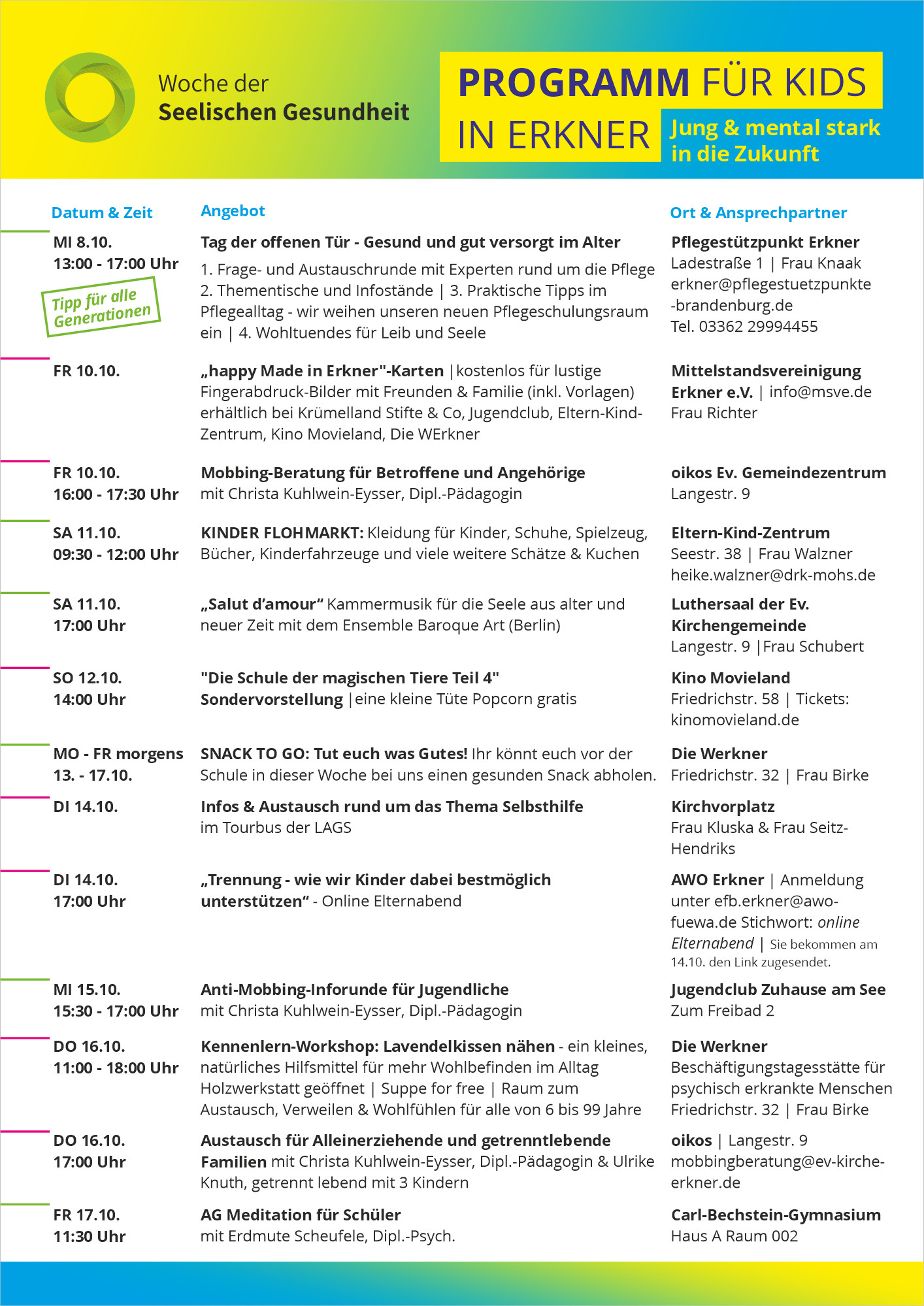 Bereits zum zweiten Mal findet in Erkner die Woche der seelischen Gesundheit statt. Noch bis zum 17. Oktober 2025 erwartet Jugendliche, Eltern und Familien ein vielfältiges Programm rund um das Thema psychische Gesundheit. Das diesjährige Motto lautet: „Jung & mental stark in die Zukunft“.