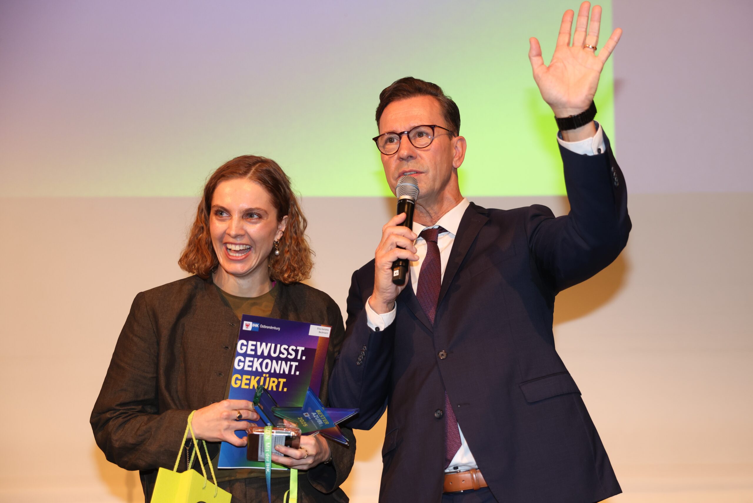 Elisa Karlotta Beckmann freut sich neben dem Moderator des Abends, Mario Schmidt, über ihre Auszeichnung. Die junge Frau hat die Ausbildung zur Industriekeramikerin Modelltechnik bei der GOLEM – Kunst und Baukeramik GmbH abgeschlossen. Sie ist in ihrem Ausbildungsberuf Bundesbeste und gleichzeitig mit 97 Punkten auch die beste Absolventin im gesamten Kammerbezirk Ostbrandenburg. © Marco Kümpfel | IHK Ostbrandenburg