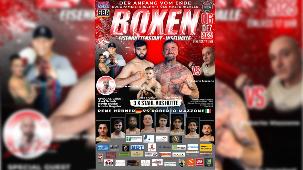 Der Anfang vom Ende Europameisterschaft Ü50 Masterklasse Rene´ Hübner gegen Roberto Mazzone. Zahlreiche Vorkämpfe mit 9 Boxern und als Special Guest "Axel Schulz". Am 6. Dezember ab 17 Uhr in…